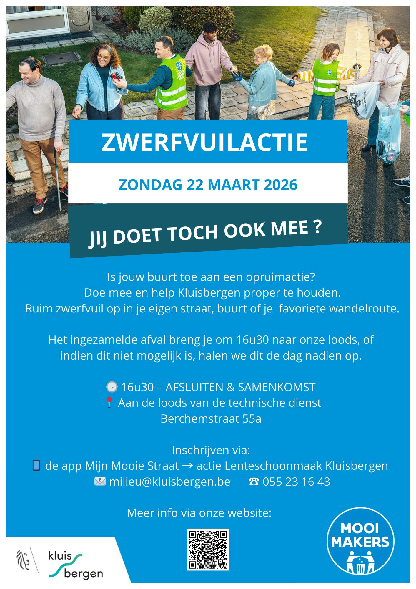 Zwerfvuilactie Kluisbergen 2026ReservationsReserveer plaatsenDatum22/03/2026 om 09:00 - 16:30PrijsGratis Basistarief: € 0,00OrganisatieGemeente KluisbergenContactAdresGemeente KluisbergenParklaan 16 9690 Kluisbergen BelgiëE-mailadresinfo@kluisbergen.beTelefoonnummer055231610Loods - Technische dienstBerchemstraat 55A 9690 Kluisbergen BelgiëTypesFestiviteit