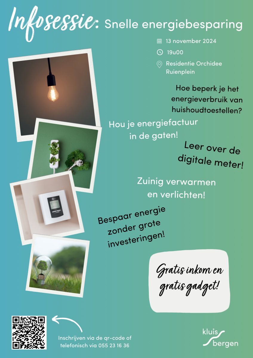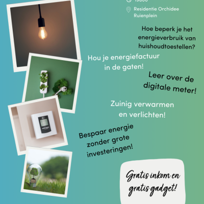 In anderhalf uur geeft een energiespecialist je praktische info over het energieverbruik van huishoudtoestellen, verwarming, verlichting en de digitale meter. We gaan verder dan enkel een dikkere trui aandoen of een deksel op je pot zetten tijdens het koken. Zo kan je nadien meteen vlotjes aan de slag met nieuwe inzichten.