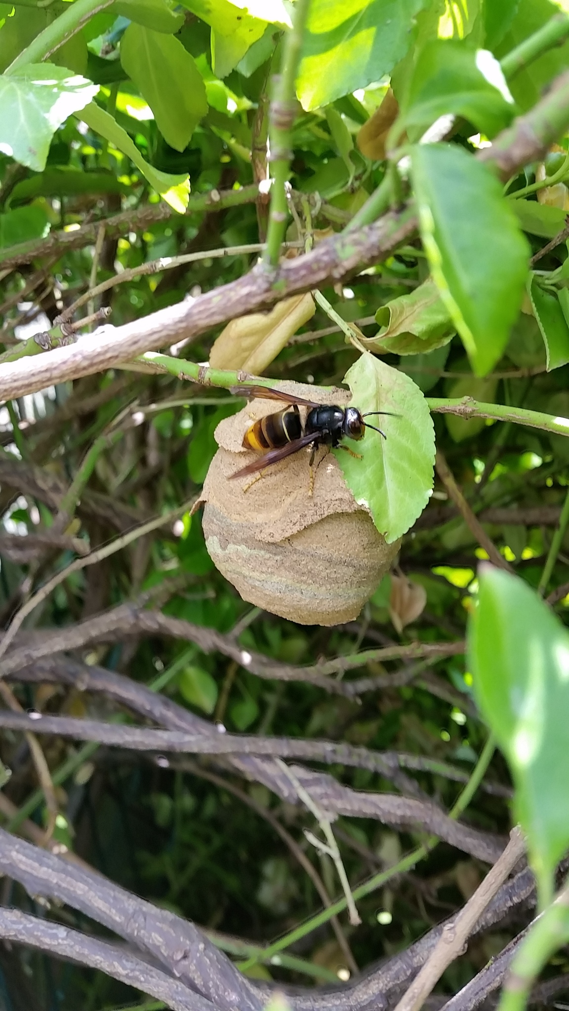 Een Aziatische hoornaar is heel beschermend naar haar nest toe en kan zeer gevaarlijk en in groep uithalen.