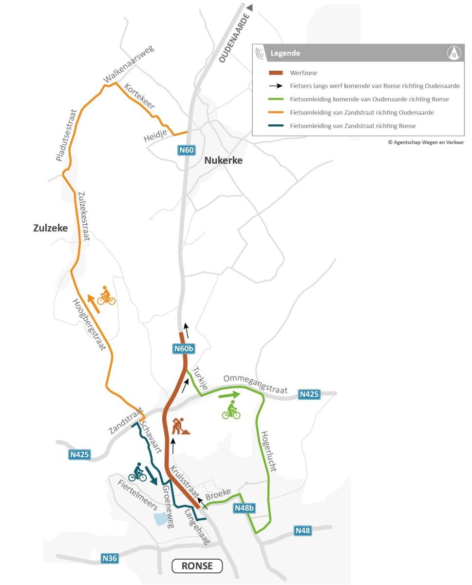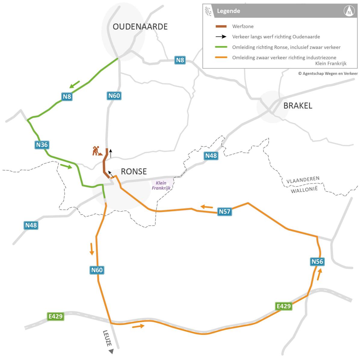 Het gemotoriseerd verkeer vanuit Gent richting Ronse volgt een omleiding vanuit Leupegem via de Berchemweg/Oudenaardebaan (N8) en de Kerkstraat/Stationsstraat/Ronse Baan/Berchemsesteenweg/Zonnestraat (N36). Zwaar verkeer richting IZ Klein Frankrijk komend van Leuze en de E429 volgt een omleiding via E429 afrit 30 (Ath) en Flobecq-Ellezelles (N57).
