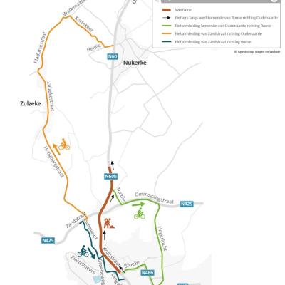 Er wordt gewerkt in 2 fasen per rijrichting waardoor het verkeer vanuit Ronse naar Oudenaarde steeds kan de werfzone passeren. De Ommegangstraat (N425) en de Zandstraat (N425)zijn afgesloten voor alle verkeer ter hoogte van de Kruisstraat (N60b).